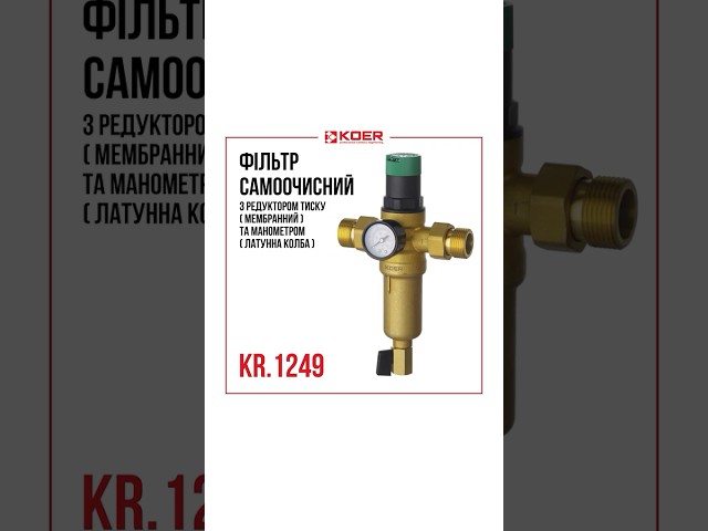 ОписKOER KR.1242 1"ЗР — магістральний самоочисний фільтр механічної очистки з інтегрованим редуктором тиску та манометром, призначений для комплексного захисту систем холодного водопостачання від механічних домішок і надлишкового тиску. Поєднує функції фільтрації, стабілізації та контролю тиску в одному вузлі, що дозволяє оптимізувати схему підключення на вводі. Оснащений підключенням 1" із зовнішньою різьбою (ЗР), що забезпечує стандартну інтеграцію у трубопровід. Корпус виконаний з латуні, колба — з ударостійкого прозорого пластику для візуального контролю ступеня забруднення. Фільтруючий елемент — сітка з нержавіючої сталі, придатна для багаторазового очищення. Самоочисний механізм із нижнім дренажним клапаном дозволяє видаляти накопичений осад без демонтажу пристрою. Вбудований редуктор підтримує стабільний вихідний тиск, захищаючи сантехнічне обладнання, бойлери та запірну арматуру від гідроударів і перевищення допустимих параметрів. Манометр забезпечує постійний контроль робочого тиску та дозволяє своєчасно оцінити стан фільтра і редукційного вузла.